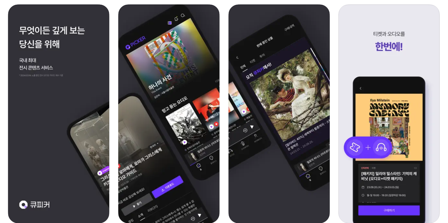 QPICKER는 전시 오디오 가이드 서비스로 전시 티켓 예매, 선물하기, 오디오 큐레이션 기능이 제공되었습니다.