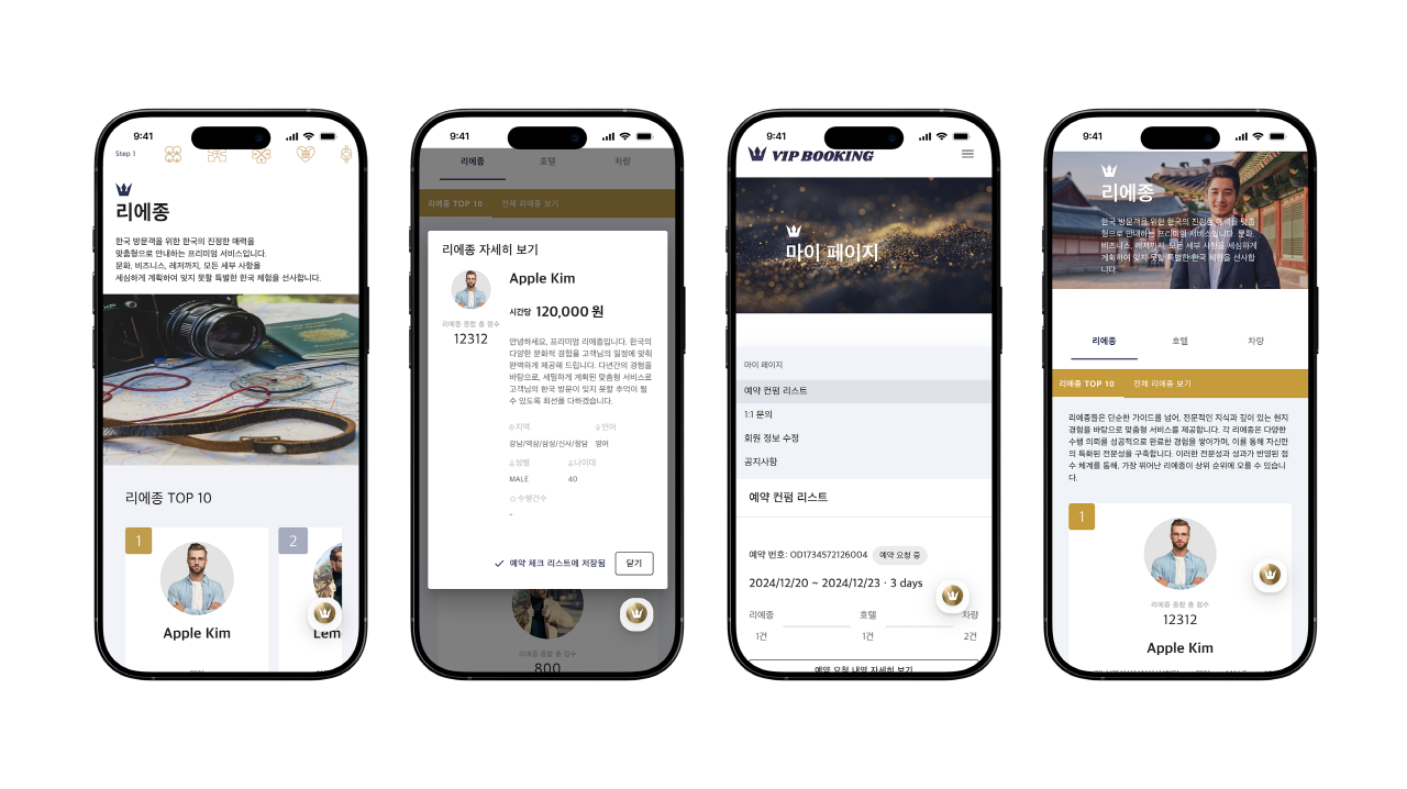 VIP BOOKING 은 VIP 고객의 여행일정에 있어서 호텔, 렌터카, 일정에 동행하는 전문 가이드 예약을 한번에 진행 및 관리 하는 여행 플랫폼으로, 선택가능한 가이드의 랭킹 시스템이 적용 되었습니다.