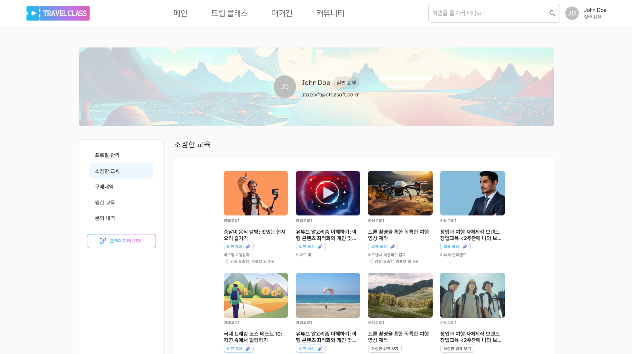 여행을 부탁해는 여행과 관련된 교육영상 구입 및 수강 뿐만 아니라 등록하여 판매도 가능한 사이트로 여행관련 매거진과 기능별 커뮤니티 게시판 기능이 제공되었습니다.